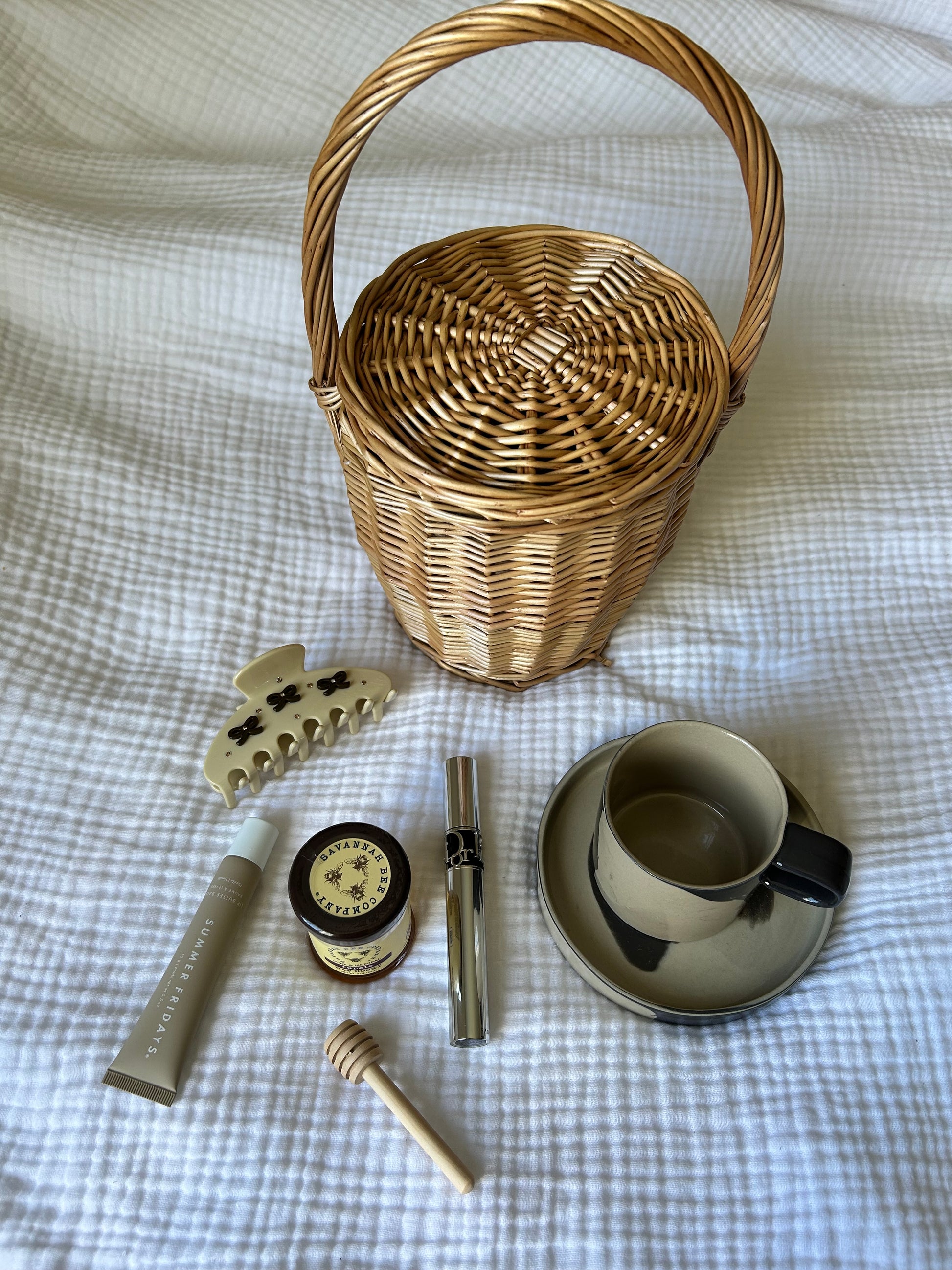 The Mathilde basket features a Ferm Living cup and saucer, Dior mascara, Emi Jay hair clip, Summer Fridays lip balm, Savannah Bee honey and honey dipper, and a white Dior makeup pouch.